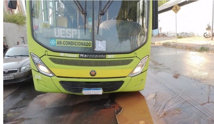 De acordo com informações de uma passageira que estava dentro do ônibus, um cano estourou e quando o ônibus Rodoviária Circular 1 foi passar o asfalto acabou cedendo.