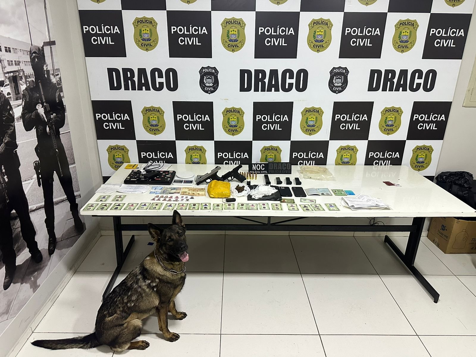 Durante a operação, foram conduzidos F.H.D.R., F.E.P. D., e K.J.NE.S. Além disso, foram apreendidas duas pistolas com a numeração raspada, munições, entorpecentes, aparelhos celulares, veículos e cédulas de identidades falsas.