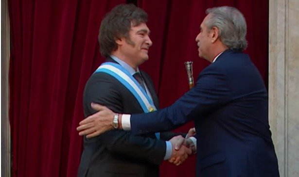 Javier Milei tomou posse neste domingo (10) na presidência da Argentina. O agora ex-chefe do Executivo da Argentina, Alberto Fernández, passou a faixa e o bastão presidencial para o novo presidente do país.