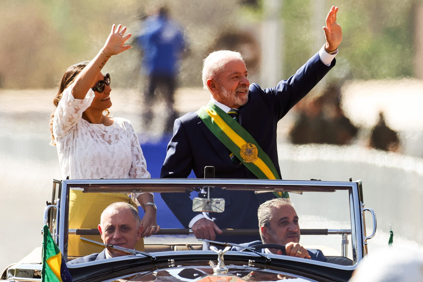 Ao lado da primeira-dama, Janja da Silva, Lula chegou em um carro aberto, o tradicional Rolls-Royce presidencial, antes de inspecionar as tropas nas proximidades do Palácio do Planalto. Assim que desembarcaram na tribuna, o presidente e a primeira-dama foram recebidos pelo ministro da Defesa, José Múcio Monteiro, e pelos líderes das três Forças Armadas.