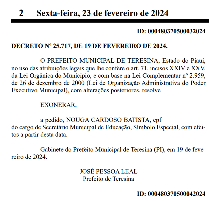 Nouga Cardoso foi exonerado da Secretaria Municipal de Educação de Teresina (Semec). A saída foi do gestor publicada no publicado no Diário Oficial do Município desta sexta-feira (23).