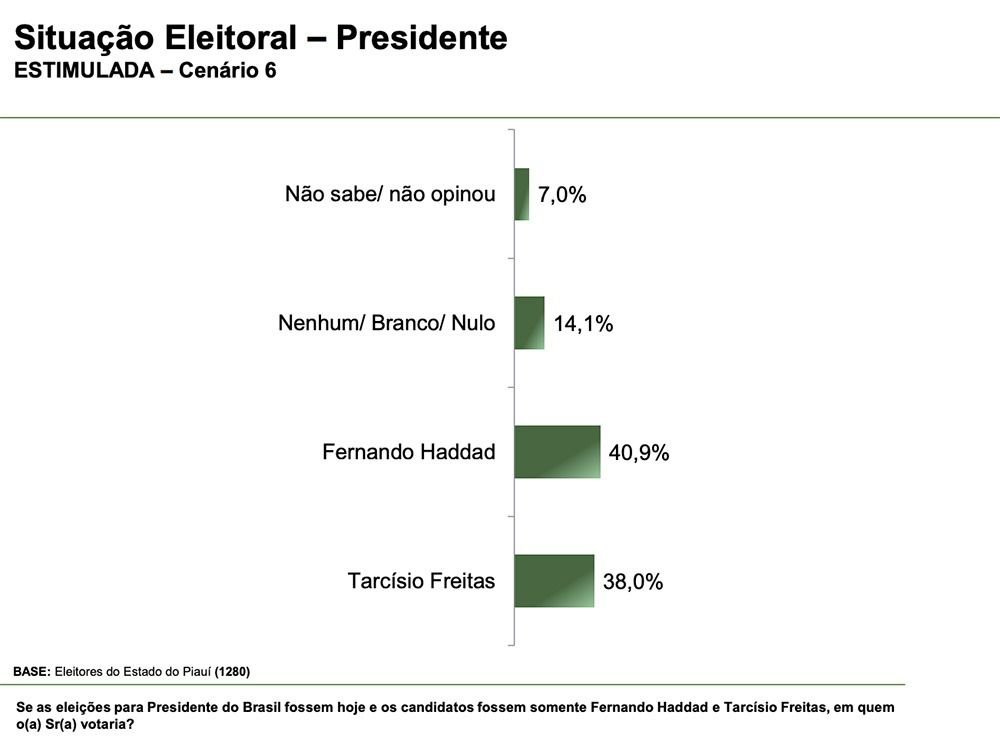 Por fim um sexto cenário, com Lula saindo de cena e entrando um substituto do PT, que seria o ministro Fernando Haddad, em disputa contra Tarcísio. O resultado seria apertado, com o petista registrando 40,9% e o governador paulista 38%.